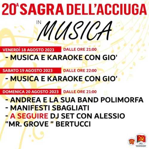 Al termine dei dibattiti non mancherΓ la musica: stasera e domani musica e karaoke con GiΓ³ a partire dalle ore 22 mentre domani, dalle 21, si alterneranno “Andrea e la sua Band Polimorfa”, “Manifesti Sbagliati” e, a seguire, Dj set con Alessio “Mr.Groove Bertucci.