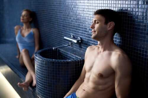 Couple spending a day at health spa and relaxing in a steam room. Focus is on man with eyes closed.