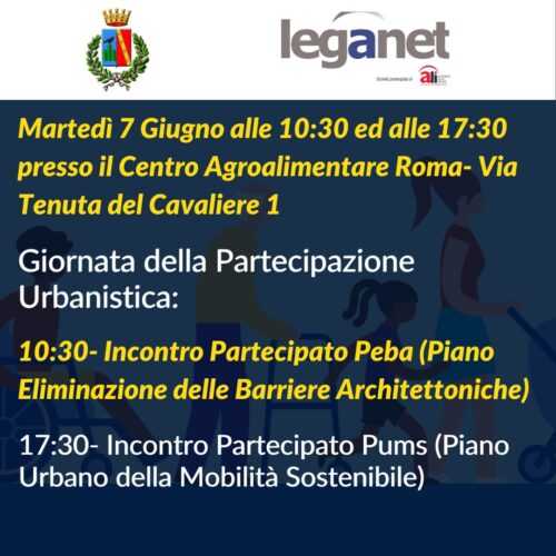 – martedì 7 Giugno ore 10.30 Incontro Partecipativo PEBA (Piano per l’Eliminazione delle Barriere Architettoniche).