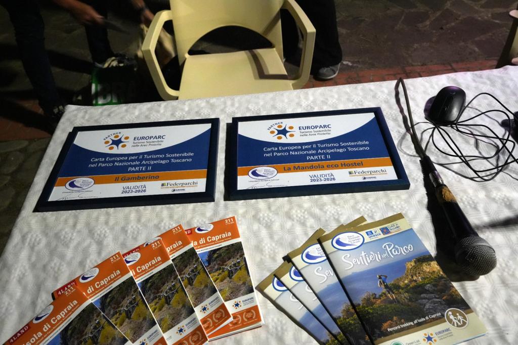 Sofia Mannelli proprietaria del “Gamberino” e Nadia Fardella, direttrice dell’Eco Hostel La Mandola, hanno ricevuto dalle mani del Sindaco Lorenzo Renzi e del Presidente del PNAT Giampiero Sammuri il certificato rilasciato da Europarc, Federparchi e PNAT, la targa in plexiglass che verrà esposta all’esterno delle strutture, un pannello relativo alla carta sentieristica dell’Isola di Capraia e i diversi materiali promozionali per allestire la “libreria verde” del Parco.