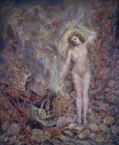 In una Livorno attraversata dai miti dannunziani e dalle teorie estetiche di Angelo Conti, oltre che dall’eco horror dei racconti fantastici di Edgar Allan Poe filtrata dalle traduzioni firmate da Charles Baudelaire, fondi marini e antichi giardini diventano teatri di visioni spirituali, come confermano le sirene fluttuanti tra la flora e la fauna degli abissi vagheggiati da Gino Romiti, così come i suoi parchi e angoli d’orto si trasformano in misteriosi labirinti dove resta possibile intraprendere un percorso iniziatico.