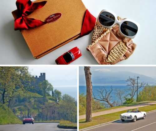 Il buono viene recapitato in un’elegante box, perfetto da mettere sotto l’albero, che contiene anche guantini in pelle da perfetto slow driver, occhiali da sole anni ’60 per la navigatrice e mappe con i più bei tour consigliati.