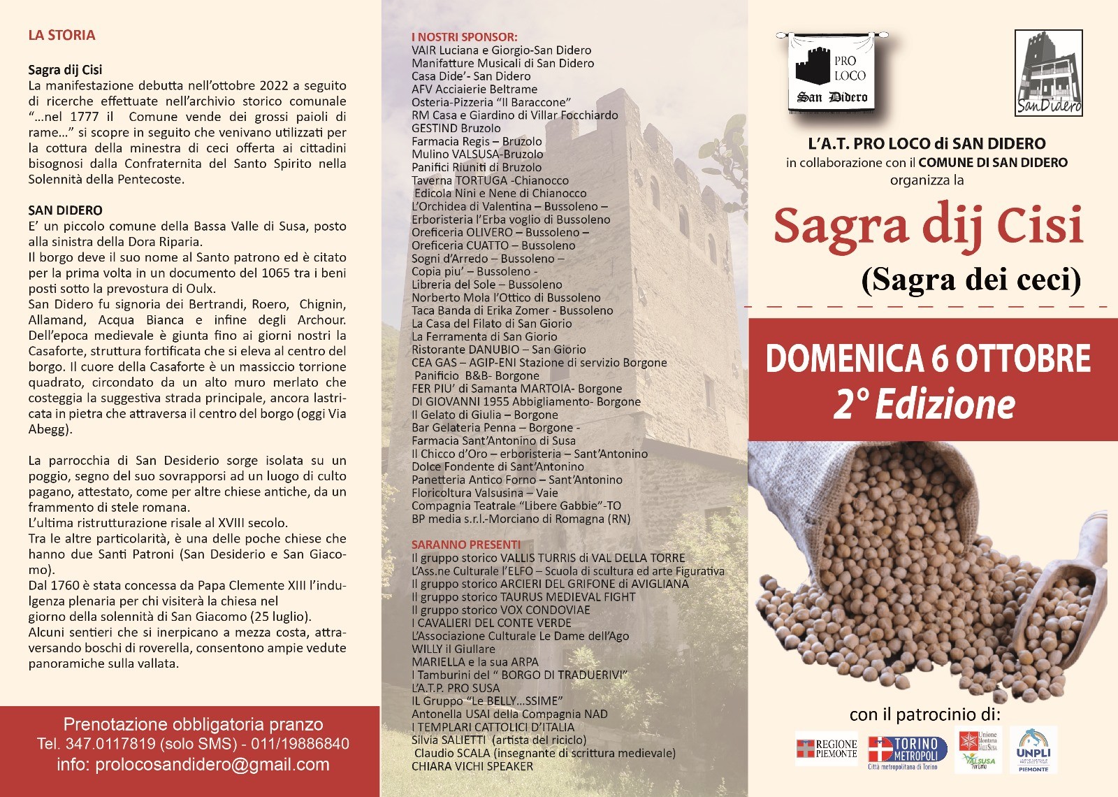 Nata nell’ottobre 2022 a seguito di ricerche effettuate nell’archivio storico comunale con il ritrovamento di un documento che parla della produzione e del consumo dei ceci, la sagra è organizzata dalla Pro Loco di San Didero con il contributo e patrocinio di Città metropolitana di Torino. Per la seconda edizione della manifestazione dedicata ai “Cisi”, legume ingiustamente considerato per lungo tempo cibo povero, propone un ricco calendario di appuntamenti.