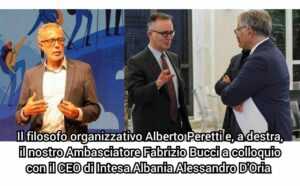 Protagonista degli avvenimenti in questione, fortemente voluti da Intesa, è stato il famoso filosofo organizzativo Professor Alberto Peretti, che assieme al dottor D’Oria è intervenuto sia presso la Residenza della nostra Ambasciata in Tirana, sia presso l’auditorium Tonin Harapi: rispettivamente per la conferenza dal titolo “Il lavoro che cambia, la via italiana quale leva competitiva per le imprese mediterranee”, organizzato assieme a Confindustria e Camera di commercio Italiana in Albania, e per il workshop “Banca in movimento – Il cambiamento performante”, con la partecipazione di un centinaio di dipendenti e collaboratori dell’istituto di credito.