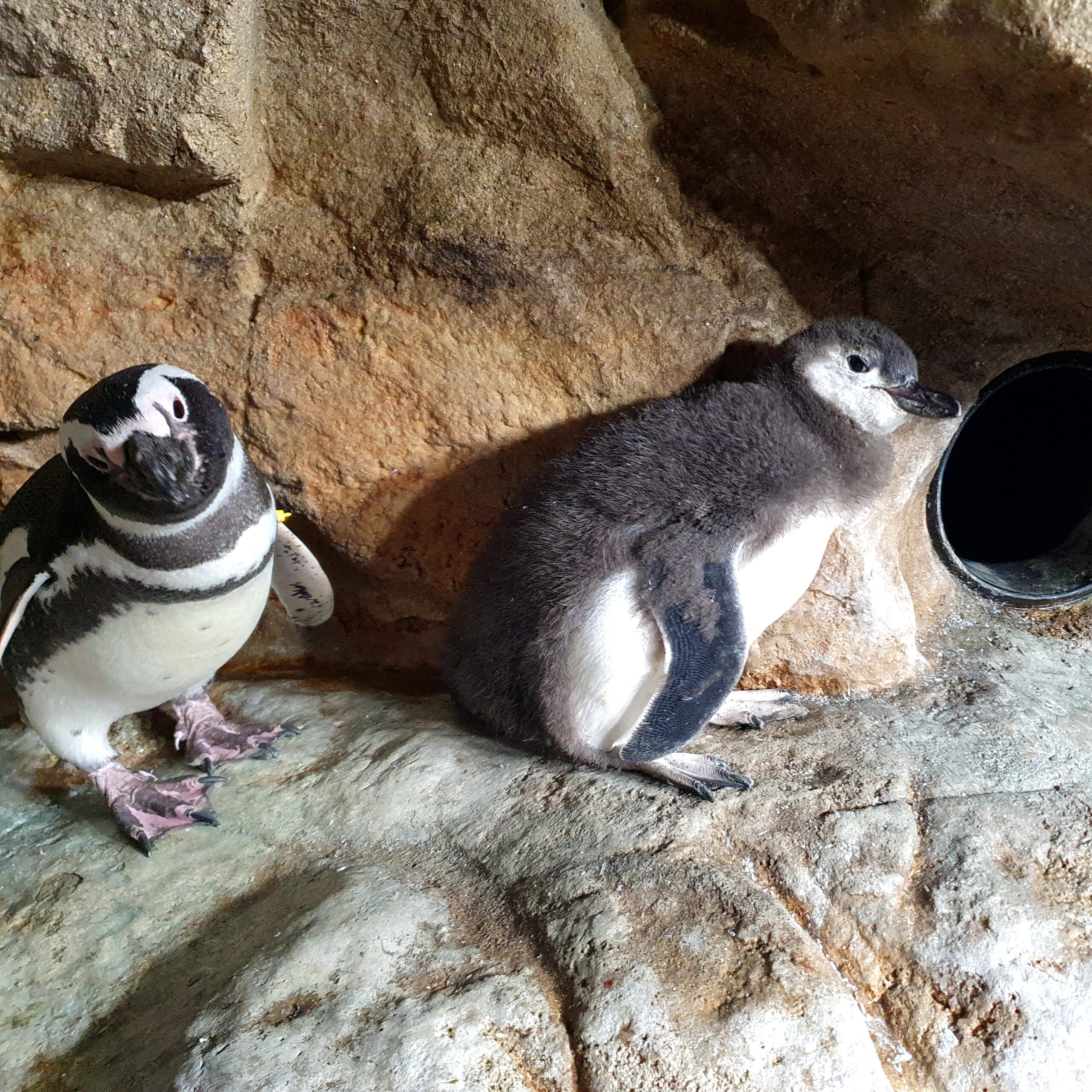 Nella vasca sono visibili ora anche i tre pulcini di pinguino di Magellano (Spheniscus magellanicus), nati a metà giugno da uova deposte nei nidi ad inizio maggio. Accuditi da mamma e papà, stazionano nei pressi dei rispettivi nidi.