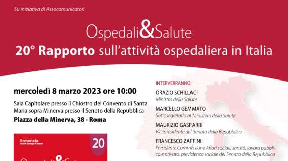 Mercoledì 8 marzo, alle ore 10.00, presso la Sala Capitolare di Palazzo della Minerva del Senato della Repubblica, in Piazza della Minerva 38, si terrà la presentazione del 20° Rapporto sull’attività ospedaliera in Italia “Ospedali&Salute”, promosso da Aiop, l’Associazione italiana ospedalità privata, in collaborazione con Ermeneia – Studi & Strategie di Sistema
