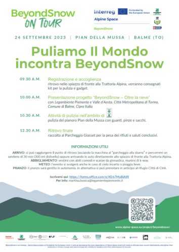 AL PIAN DELLA MUSSA DOMENICA 24 SETTEMBRE L’INIZIATIVA “PULIAMO IL MONDO” INCONTRA IL PROGETTO “BEYONDSNOW”