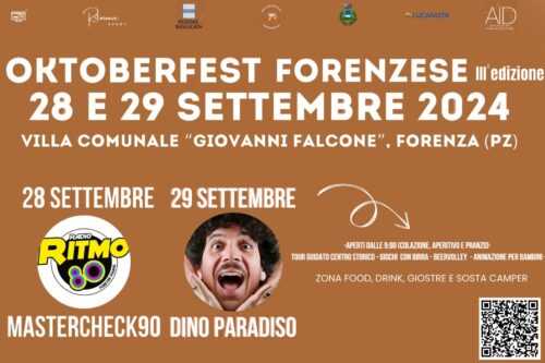 E per i camperisti, è prevista un’area sosta camper. Patrocinato dal Comune di Forenza, con il patrocinio gratuito della Regione Basilicata, e in collaborazione con AID Agenzia di Comunicazione e Lucanista, la terza edizione dell’Oktoberfest Forenzese, frutto di un lungo lavoro portato avanti dai giovani e tenaci organizzatori di Forenza Webtv e Ritmoove, promette di stupire grazie anche agli “ospiti di eccezione”: sabato 28 settembre il piccolo borgo lucano farà un tuffo nei grandi successi del passato con Ritmo 80 e il suo Mastercek 90, mentre il giorno successivo spazio alla genuina e ironica comicità di uno dei più grandi talenti della scena comica (e non solo) lucana, Dino Paradiso con “Ma io sono lucano”.
