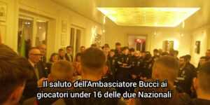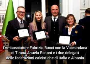 Ricevuti ieri sera nella residenza diplomatica di casa Italia dal nostro Ambasciatore Fabrizio Bucci, coadiuvato dalla vicesindaca Anuela Ristani e dai delegati rispettivamente delle due federazioni nazionali, i giovanissimi alfieri italiani e albanesi del pallone hanno rafforzato l’orientamento a che l’amicizia costituisca uno stabile fattore arricchente del pur sano agonismo tipico di qualsiasi gara calcistica.