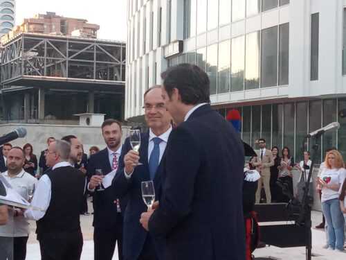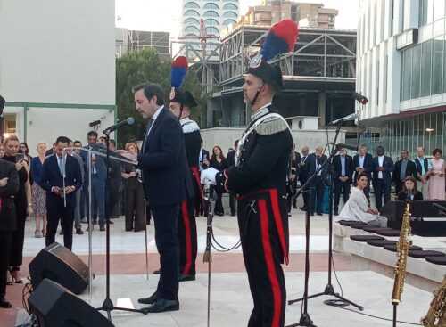 “L’Inno nazionale dell’Italia fu composto da Goffredo Mameli e come prima parola ha “Fratelli”, che rappresenta la caratteristica fondativa di due Popoli la cui unione ha radici storiche e secolari sopravvissute e consolidatesi oltre le singole epoche e circostanze. Siamo qui per parlare di Storia in senso culturale e di Futuro in senso prospettico e dinamico, perché la libertà, nel comune destino europeo, si costruisce con l’azione, e viceversa”. Lo ha ribadito, con emozione comprensibile, sua eccellenza l’Ambasciatore Marco Alberti nel proprio intenso e accorato messaggio di saluto alle molto numerose delegazioni ministeriali, diplomatiche, economiche e politico amministrative intervenute nel salone cerimoniale e nel grande quadrilatero del cortile dell’ex hotel Dajti, oggi sede del Quartier generale della Banca centrale albanese, edificio che fu realizzato da un italiano e che oggi ospita la prestigiosa Istituzione finanziaria e di politica monetaria “di cui – ha ricordato il nostro Ambasciatore – si celebrano oggi i primi cent’anni di esistenza e di operatività dalla sua fondazione”.