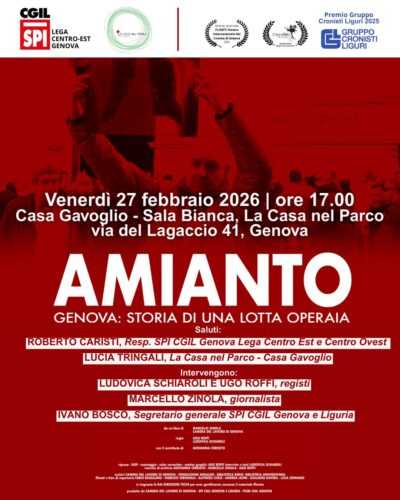 Sarà proiettato venerdì 27 febbraio 2026 alle ore 17.00, presso la Sala Bianca della Casa Gavoglio – Casa nel Parco in via Lagaccio 41 a Genova, il docufilm “Amianto. Genova: storia di una lotta operaia“, che racconta una battaglia sindacale durata oltre dieci anni, condotta dalla classe operaia genovese per il riconoscimento dei propri diritti e della propria dignità.