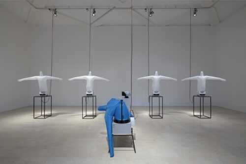 L’installazione si interroga sul divenire immagine dell’oggetto tecnico. L’attività delle macchine da stiro modificate sembra un’animazione GIF tridimensionale e materica, una vignetta di TikTok, la cui seduzione è implicata dall’eterna ripetizione. Il robot da stiro produce l’illusione della vita in maniera prevedibile, rimettendola ciclicamente in scena: l’aria spinge i sacchi di tessuto sintetico al limite e li fa quasi esplodere prima di un arresto cardiaco che li porta al collasso. Risate, applausi, pronti, ripartenza. Esiste una dimensione esistenziale, in questa animazione, veicolata dal respiro, la tecnologia di sopravvivenza del corpo umano. Il gonfiarsi di questi manufatti industriali sembra andare oltre la necessità di un soggetto umano come agente attivatore, proiettandoli verso una sorta di autonomia ontologica. Chi sono, poi, i palloni gonfiati? In realtà i marchingegni esibiti sono docili e condannati alla sostituzione. Sono diventati una minoranza, nel gioco delle parti del progresso, e intercettano un aspetto cruciale dell’antropocentrismo: l’idea che il mondo sia al servizio dell’uomo e costretto a una condizione di eterna schiavitù.