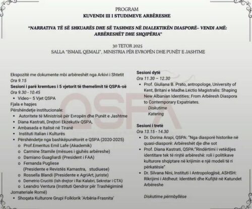 Domani, giovedì 30 ottobre, la sala conferenze del Ministero per l’Europa e gli Affari esteri della Repubblica d’Albania ospita la terza edizione della Conferenza plenaria indetta dal Centro per gli studi e le pubblicazioni Arbereshe, diretto dalla Professoressa e ricercatrice accademica Diana Kastrati