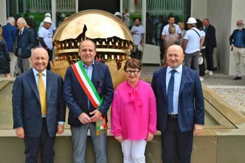 Ieri il Sindaco di Suno (No) ha salutato l’installazione dell’opera d’arte di Arnaldo Pomodoro davanti ai nuovi spazi produttivi della storica sede di Nobili, insieme ai tre figli del fondatore dell’azienda leader mondiale nella rubinetteria: Alberto, Maria Grazia e Pierluigi Nobili (nella foto insieme al primo cittadino).