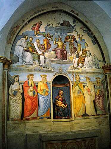 PERUGIA – Si chiama affresco della “Trinità e Santi”, misura 175 x 389 cm ed è stato iniziato tra il 1505 ed il 1508 e completato poi nel 1521 “nientepopodimenochè” dal grande Raffaello – che lo lasciò incompiuto per recarsi a Roma da papa Giulio II – quindi terminato (l’anno dopo la morte di Raffaello) dal suo maestro, Pietro di Cristoforo Vannucci, meglio noto come “il Perugino”.