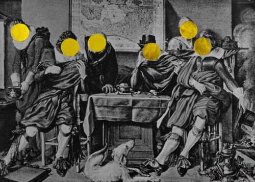 I dipinti che ritraggono la società colonialista nella sua tracotanza vengono così sovrascritti con stickers dorati sugli occhi di politici e ricchi mercanti, a richiamare l’avidità che mosse alla ricerca di metalli preziosi, generando schiavitù e sfruttamento minerario; mentre gli sticker rossi nascondono i visi, presagendo l’allarme della violenza; e sticker d’argento sembrano evocare le 30 monete di Giuda: denari in nome dei quali l’individuo perse una porzione ingente della sua umanità. Grazie a colori vibranti e motivi decorativi Peim crea composizioni dal forte impatto visivo, attraverso le quali sfida costantemente se stesso e i fruitori della sua arte, che quest’estate finalmente approda nel nord-est d’Italia.