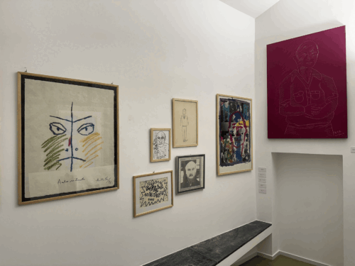 Le opere selezionate spaziano in un percorso che va dal 1958 al 1999 proponendo una sintesi di tecniche e stili: da Autoportrait, tela emulsionata del 1969, per giungere a Autoritratto napoleonico, lamiera con interventi di décollage e sovrapittura, passando attraverso un’altra lamiera dove compare l’artista con la figlia Asya sulle spalle. Non manca poi una scultura in bronzo con i tratti del motociclista e alcuni disegni autoironici e caricaturali.