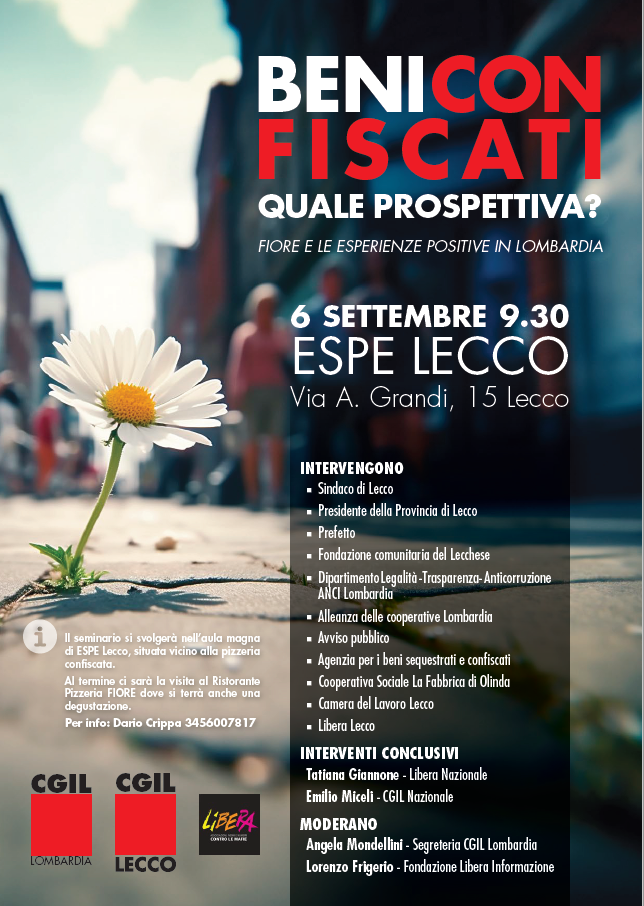 Mercoledì 6 settembre 2023 alle ore 9:30, presso l’ESPE di Lecco (Via Grandi 15), si terrà un seminario sul tema dei beni confiscati alla criminalità organizzato da CGIL Lombardia, CGIL Lecco, Libera Lombardia e Libera Lecco