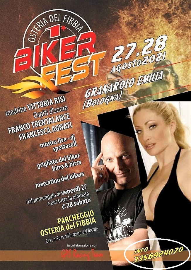 Bologna – Prima edizione del Biker Fest, venerdì 27 e sabato 28, negli spazi all’aperto della storica Osteria del Fibbia di Granarolo dell’Emilia (BO). Un fine settimana in pieno stile due ruote: birra e salsiccia, motociclette, musica e mercatino all’aperto, con tanti ospiti d’eccezione. Il primo a saltare in sella è l’attore e scrittore Franco Trentalance, ex divo del cinema a luci rosse e volto noto della TV. L’autore e artista bolognese è un appassionato motociclista ed è testimonial dell’associazione MotorLab: sabato è alle griglie per cucinare“La salsiccia di Trentalance” e promuovere la sicurezza stradale. Mentre la conturbante madrina del weekend emiliano è l’attrice Vittoria Risi, ex collega di Trentalance e nota alle cronache rosa per la passata relazione con Vittorio Sgarbi. Ha inoltre confermato la propria partecipazione la conduttrice Francesca Agnati, volto motorsport di Go-TV. Durante il Biker Fest vengono messe in palio alcune esclusive t-shirt, firmate da Franco Trentalance, che includono alcune ironiche massime a doppio senso: da “spingo al massimo”, a “dacci dentro”. Il rombante appuntamento per i motociclisti parte venerdì 27 nel pomeriggio e si svolge per tutta la giornata di sabato 28 agosto, nel parcheggio della storica Osteria del Fibbia di Granarolo dell’Emilia (BO).