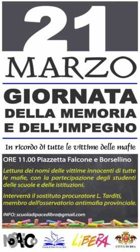 Il 21 marzo di ogni anno si celebra la Giornata della memoria e dell’impegno in ricordo delle vittime innocenti delle mafie. Si tratta di un’iniziativa pubblica promossa dall’associazione Libera in cui vengono letti ad alta voce i nomi di tutti i caduti per mano delle mafie con l’intento di non far scomparire il loro ricordo dalla memoria collettiva.