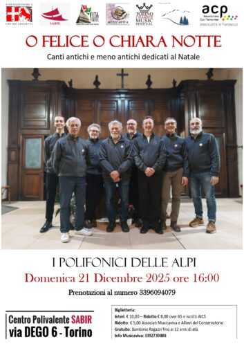Nell’ambito di Torino Chamber Music Festival il complesso corale “I Polifonici delle Alpi” proporrà un percorso sonoro offrendo momenti di riflessione e serenità con il concerto “O felice o chiara notte” – canti antichi e meno antichi dedicati al Natale – , domenica 21 dicembre alle ore 16 al “Centro Sabir” di via Dego 6, un centro contro la violenza, per la dignità e la libertà, che è anche uno spazio culturale e sociale che riunisce oltre quaranta associazioni del territorio ed offre attività teatrali, musicali e culturali.