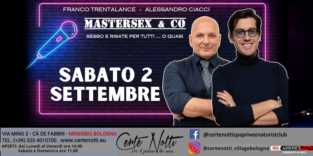 MasterSex, che fin dal titolo parafrasa il celebre programma TV, offre ai commensali riuniti al club Certe Notti di Minerbio, alcuni: spunti, riflessioni e tecniche, anche mutuate dall’esperienza di Franco Trentalance, in materia di conquiste ed erotismo. L’attore bolognese, volto noto della TV ed ex “talpa” amata dal pubblico del famoso reality, oggi è un personal coach, autore e scrittore, con all’attivo alcuni romanzi e un fumetto.