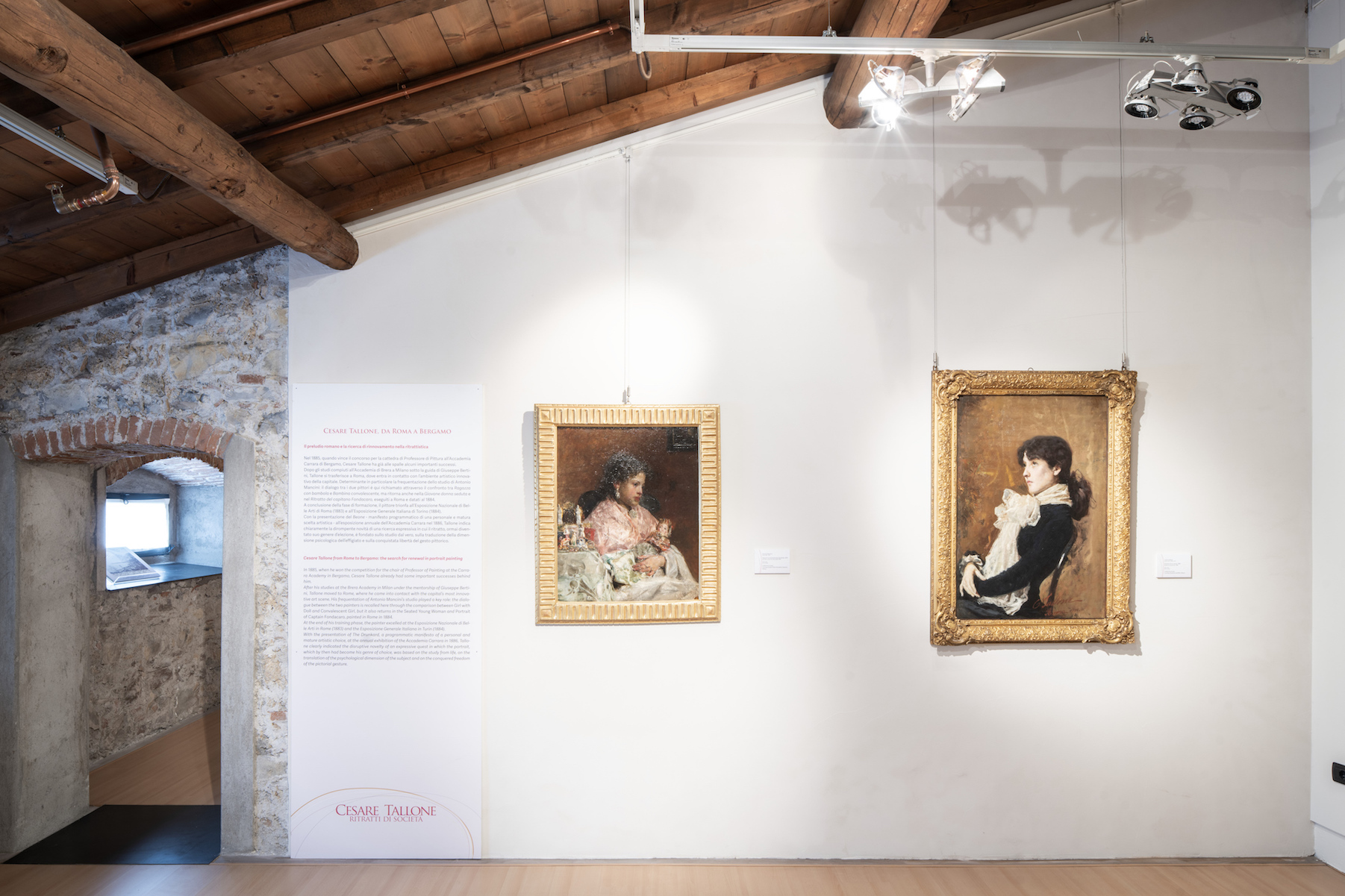 L’esposizione propone oltre quaranta dipinti del pittore accostati a fotografie, sculture e progetti architettonici per un totale di circa 80 opere, molte delle quali inedite, provenienti da collezioni pubbliche (Accademia Carrara, Fondazione Brescia Musei, Galleria Ricci Oddi di Piacenza) e da raccolte private, con l’obiettivo di restituire il percorso di Tallone durante il suo periodo bergamasco e con un focus sull’attività svolta a Lovere, finora mai indagata. I ritratti eseguiti dall’artista sono messi in rapporto con altre forme di rappresentazione, in particolare con la fotografia e il disegno architettonico, e in molti casi assumono il valore di importanti testimonianze dei valori familiari e delle relazioni sociali che animavano la società tra Bergamo e Lovere nell’ultimo quarto dell’Ottocento.