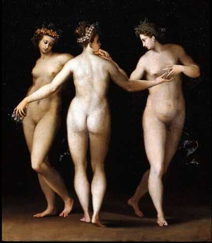 Anche nella Primavera di Sandro Botticelli le tre Grazie sono raffigurate nello stesso modo, “allacciate” in un reciproco abbraccio e con la dea centrale vista di schiena.