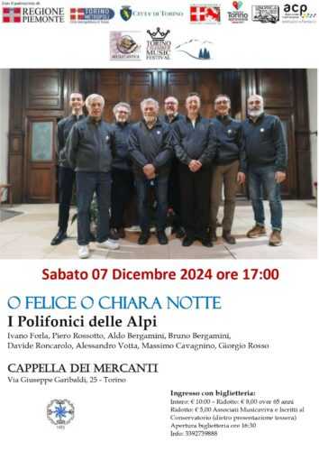 TORINO – Nell’ambito di Torino Chamber Music Festival, sabato 7 Dicembre alle ore 17 nella Cappella dei Mercanti di via Garibaldi 25, il gruppo corale “I polifonici delle Alpi” si esibirà in “O felice, o chiara notte”, un concerto dedicato al canto sacro con particolare attenzione ai momenti salienti della vita di Gesù: la nascita e la morte.