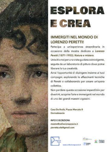 Curato da Eleonora Perretta, il laboratorio vuole favorire la collaborazione tra compagni di classe, insegnare tecniche di pittura e osservazione attraverso la replica di un’opera e avvicinare all’arte di Lorenzo Peretti, esprimendo liberamente la propria creatività e fantasia. Il laboratorio prenderà il via con un primo incontro dedicato agli utenti del C.I.S.S. Domodossola.