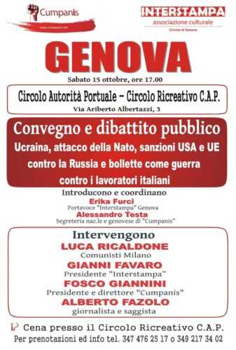 Di tutto questo si parlerà, a Genova, sabato 15 ottobre, dalle ore 17.00, presso il Circolo dell’Autorità Portuale / Circolo Ricreativo Cap, in un Convegno organizzato dalle Associazioni “Cumpanis” e “Interstampa”. Interverranno Erika Furci, di “Interstampa” Genova, Alessandro Testa, di “Cumpanis” Genova e della segreteria nazionale di “Cumpanis”, Luca Ricaldone, di “Comunisti Milano”, Gianni Favaro, Presidente di “Interstampa”, Fosco Giannini, direttore di “Cumpanis” e Presidente dell’Associazione omonima e Alberto Fazolo, saggista e giornalista.