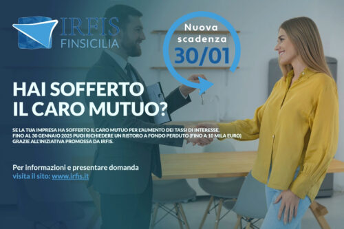 Irfis ricorda che è stato prorogato il termine di presentazione della domanda per la misura “Contributi a fondo perduto per l’abbattimento degli interessi sui mutui in essere al primo gennaio 2024 a favore delle micro, piccole e medie imprese” fino al 30 gennaio alle 17.