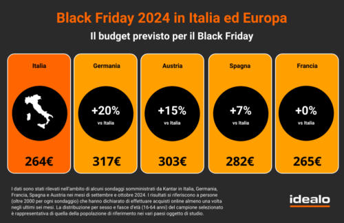 Se i nostri connazionali attendono con entusiasmo l’arrivo del Black Friday, anche negli altri paesi si respira aria di trepidante attesa. In particolare, i dati resi noti da idealo[3], evidenziano interessanti analogie e differenze a livello europeo quando si parla di budget: in cima alla classifica si posiziona la Germania, dove quest’anno la spesa media stimata si aggirerà intorno ai 317 euro, seguita da Austria (303 euro) e Spagna (282 euro). A parimerito con l’Italia (264 euro) invece la Francia, il cui budget resta intorno ai 265 euro.