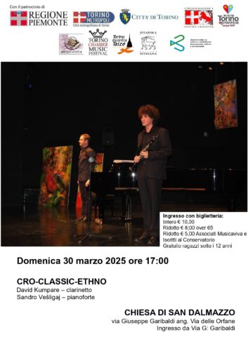 TORINO – Il concerto che oggi suggeriamo – Cro-Classic-Ethno – per Musicaviva propone un Duo strumentale composto da un pianoforte suonato da Sandro Vesligaj ed un clarinetto suonato da David Cumpare e presenta gradevoli opere di compositori contemporanei croati che hanno saputo creare e fondere con maestria un linguaggio musicale ricco di sonorità classiche e moderne, anche ispirandosi al ricco folclore locale.