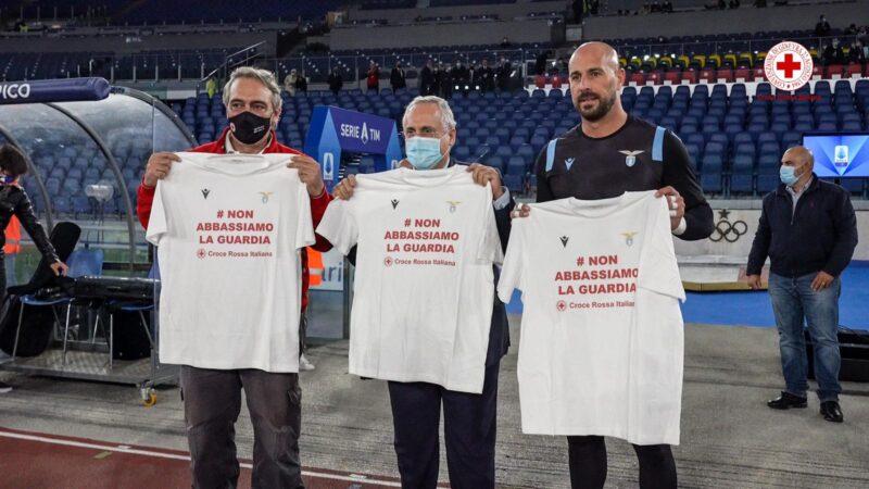 #CroceRossa e S.S. Lazio in campo all’Olimpico per lanciare una campagna di sensibilizzazione contro il #Covid19. #NonAbbassiamoLaGuardia, il messaggio sulla maglia indossata dal Presidente CRI Francesco Rocca, dal Presidente della squadra