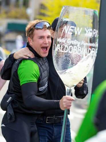 Gli oltre trentamila ciclisti, pronti ad invadere le strade e i ponti della città per un giorno completamente chiusi al traffico, hanno fatto da cornice ad un brindisi con il Conegliano Valdobbiadene Prosecco Superiore Docg di Villa Sandi, fatto arrivare appositamente dall’Italia, che ha coinvolto gli ospiti italiani e le autorità newyorchesi. Particolarmente applaudito il gigantesco e scenografico calice (1,50 metri d’altezza) realizzato dal maestro del vetro, Marco Varisco, che riportava la scritta “New York – World Cycling Monuments Events – Valdobbiadene”.