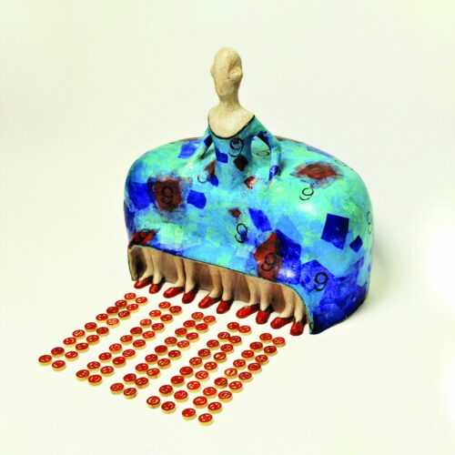 Il percorso si chiude con una sontuosa tavola apparecchiata per due coperti in cui pietanze e stoviglie prendono vita autonoma e diventano esseri bizzarri, in cui la terracotta rivestita in bianco e oro si finge, senza riuscire, porcellana di Capodimonte.
