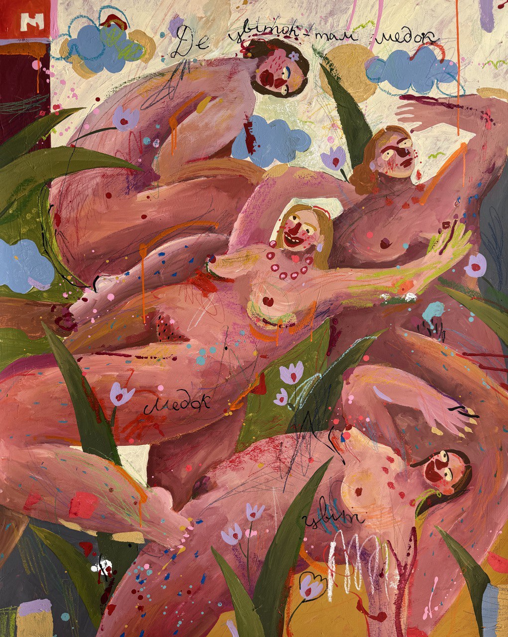 Iryna Maksymova usa un linguaggio semplice e immediato di matrice neoprimitivista, in cui si fondono influenze espressioniste e suggestioni folk che rimandano all’arte di artisti autodidatti come la pittrice ucraina Mariya Pryimachenko. I suoi grandi dipinti e i suoi arazzi cuciti a mano recuperando scampoli di tessuti in una virtuosa pratica ecologica di upcycling, esplorano il paesaggio non solo attraverso l’iconografia del nudo femminile (e maschile), ma anche tramite un bestiario composto di animali sia domestici che selvatici, spesso rappresentati come creature senzienti o come spiriti protettori.