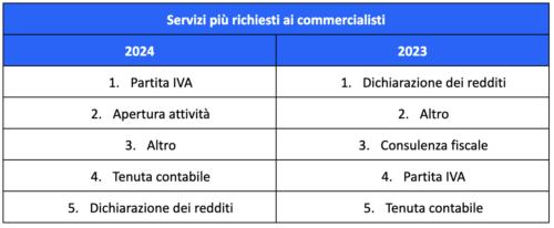 All’interno della classifica generale che inquadra invece tutte le domande rivolte ai commercialisti, la richiesta di supporto per l’apertura di una nuova attività si trova al secondo posto con il 25% delle richieste, preceduta da chi cerca aiuto per questioni relative alla partita IVA (33,9%, contro il 14,4% del 2023). In aumento, nel 2024, anche la tenuta contabile, al quarto posto con il 18,3%, mentre lo scorso anno si trovava al quinto con l’11,9%.