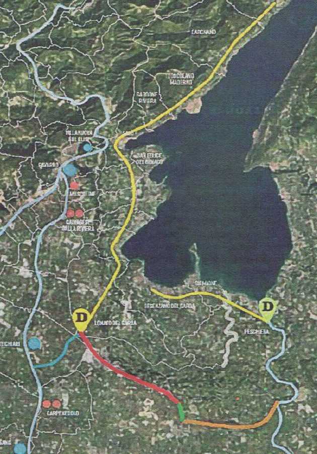 Mappa: linea gialla con D a sx l’idea del nuovo collettore gardesano, e linee rossa e verde e arancio l’idea del nuovo scarico.