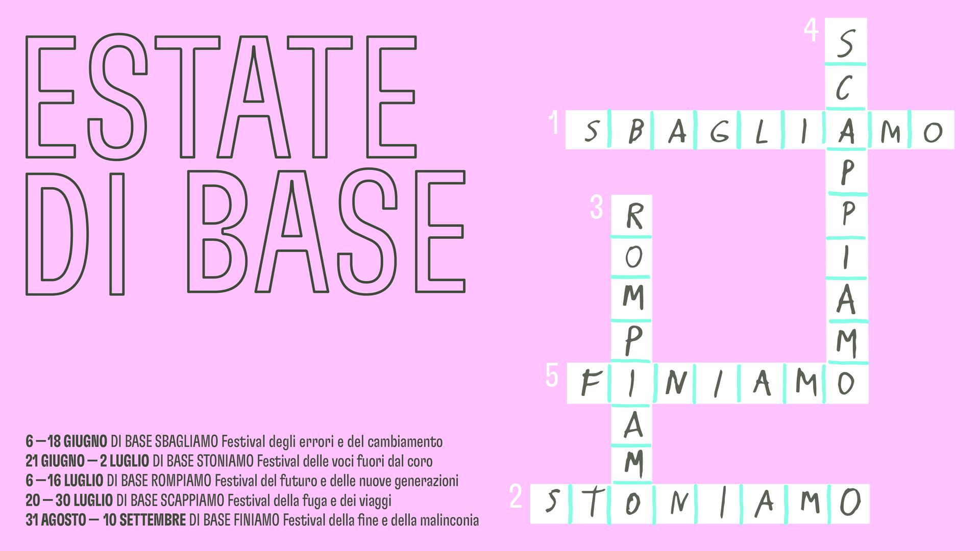 DI BASE FINIAMO è il quinto festival dell’Estate di BASE, il palinsesto estivo di BASE Milano che produce oltre cinquanta giorni di programma, 70 eventi e 120 artisti e protagonisti.