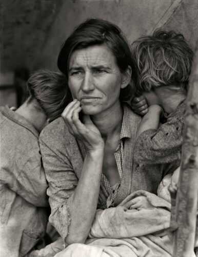 Dalle piantagioni di piselli della California a quelle di cotone degli Stati del Sud, dove la segregazione razziale porta a forme di sfruttamento ancor più degradanti, Lange realizza migliaia di scatti, raccogliendo storie e racconti riportati nelle dettagliate didascalie che le accompagnano. È in questo contesto che realizza Migrant Mother, il ritratto iconico di una giovane madre disperata che vive con i sette figli in un accampamento di tende e auto dismesse.