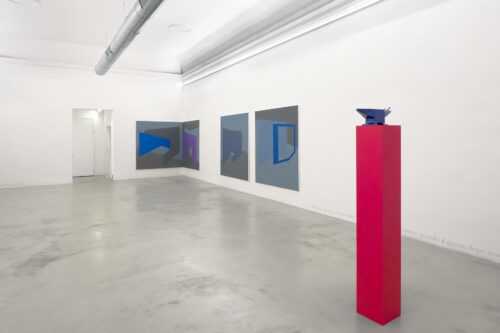 Spesso l’artista nel suo lavoro compie un’indagine sulla percezione prospettica, sulla creazione di nuovi punti di vista e sull’utilizzo “archeologico” di collage fatti di stratificazioni o giustapposizioni di immagini. Lo stesso accade con il mezzo pittorico – nelle opere Modulo pinto (2025) – che si configurano come ulteriori dispositivi di spargimento delle traiettorie spaziali: le campiture di colore seguono le partiture geometriche per alludere a possibili ambienti “sghembi”.