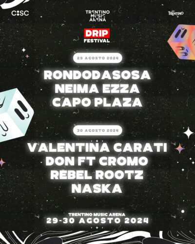 Dopo i live degli artisti della nuova scena musicale Peripezie, Centomilacarie, Mecna, Ariete, Deva, Fabrizio Moro, Il Tre, Kelly Joice, I Santi Francesi, Margherita Vicario, il nuovo appuntamento è il 29 e il 30 agosto 2024 con le masterclass e i casting dei contest pomeridiani e i concerti di “DRIP FESTIVAL” con Capo Plaza, Neima Ezza, Naska, Rondo Da Sosa, Valentina Carati, Don Ft Cromo, Rebel Rootz e a seguire il concerto degli Europe martedì 3 settembre.