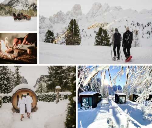 Sono 12 glass cube adults only, rifugi segreti, scrigni di relax incappucciati da un manto di neve candida che incanta la vista sul lago ghiacciato di Dobbiaco, incorniciati da balsamici abeti carichi di una soffice coltre, come l’erba che copre ogni cosa, anche i tetti. Nessun albero è stato abbattuto per la costruzione di questi nidi di relax.