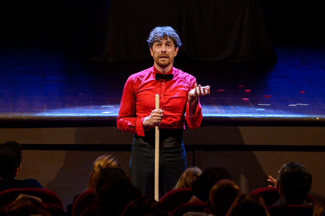 Sequestra così per un’ora il mezzo il pubblico e lo pone al centro di un esperimento unico e irresistibile, avventurandosi tra vizi, ragioni e sentimenti della fauna umana, oscillando come un esilarante pendolo tra gli estremi del sesso e della Fede, in metamorfosi continua tra i suoi personaggi, il morigerato Don Mauro schiavo di un catechismo improbabile, e l’illuminato Rashid, pizzettaio musulmano modernista.