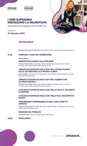 Per questa ragione e con l’obiettivo di sensibilizzare sui benefici della Exopulse Mollii suit, OMaR – Osservatorio Malattie Rare, con il contributo non condizionante di Ottobock, propone il webinar “I veri supereroi indossano la neurotuta. Neurostimolazione applicata alle malattie rare” che vedrà il confronto tra clinici, un esperto dello Sportello Legale OMaR – Dalla Parte Dei Rari e le Associazioni di pazienti.