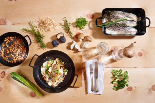 Fischmenüs für Sommerlust 2015, Alte Stiftsschmiede Gerhard Satran Bild: Kärntner Laxn, Grammel, Steinpilze, Zirbenwasser Foto Copyright by Johannes Puch www.johannespuch.at