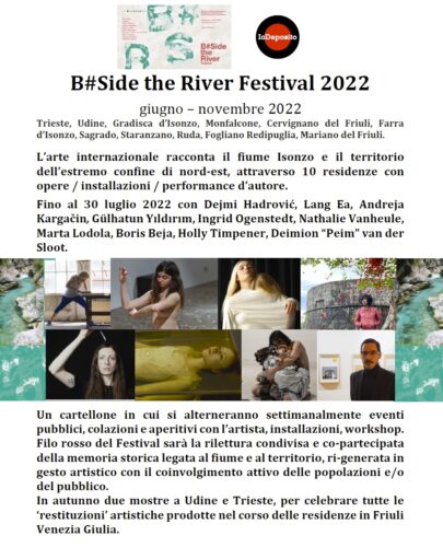 Realizzato dall’associazione di promozione artistica e culturale IoDeposito per la direzione artistica di Chiara Isadora Artico, B#Side the River vedrà protagonisti Đejmi Hadrović, Lang Ea, Andreja Kargačin, Gülhatun Yıldırım, Ingrid Ogenstedt, Nathalie Vanheule, Marta Lodola, Boris Beja, Holly Timpener, Deimion van der Sloot: ciascun artista si renderà artefice di una propria rilettura della storia dei luoghi di confine intorno al fiume Isonzo, in rapporto alle comunità del territorio che saranno parte attiva del progetto e potranno partecipare a laboratori, passeggiate sensoriali e sonore, aperitivi e colazioni con l’autore, a performance di straordinario impatto artistico ed emozionale.