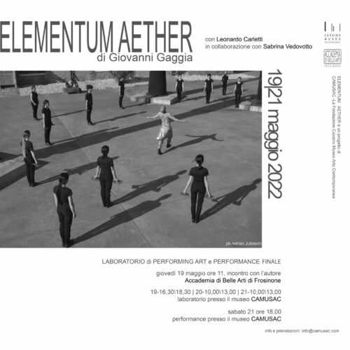L’azione verrà preceduta da una presentazione presso l’Accademia di Belle Arti di Frosinone e da un workshop della durata di tre giorni negli spazi del CAMUSAC con la partecipazione teorica e pratica degli studenti dell’Accademia. Di nuovo, come nel 2019, performers provenienti dalla Accademia di Belle Arti di Frosinone, vestiti di nero e con in mano componenti di corten quadrati, realizzati